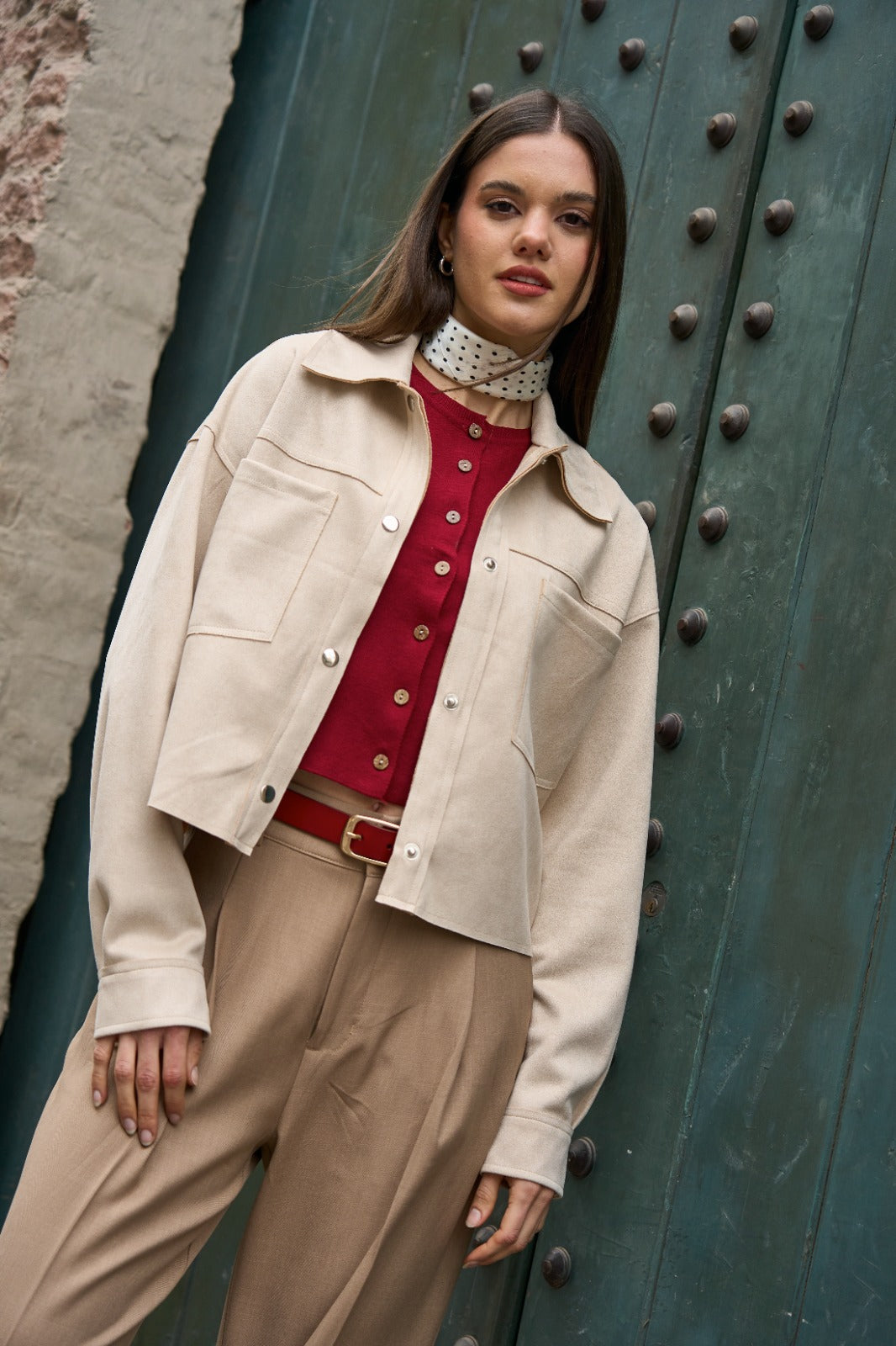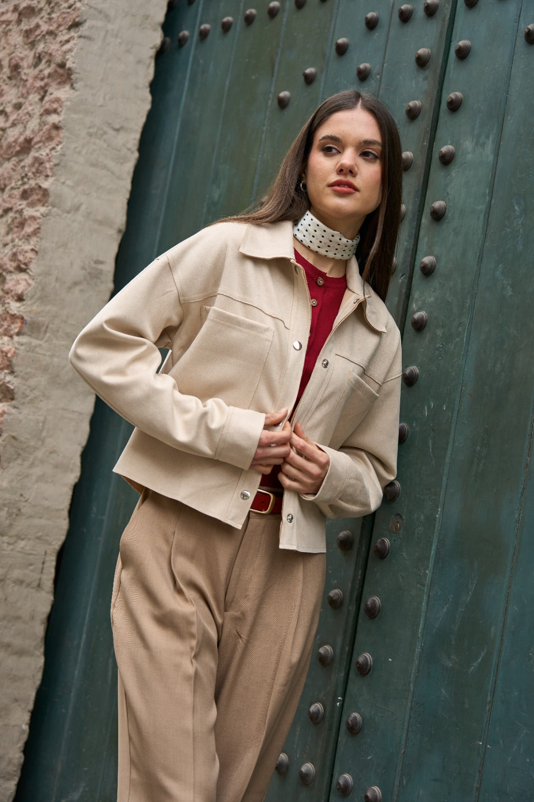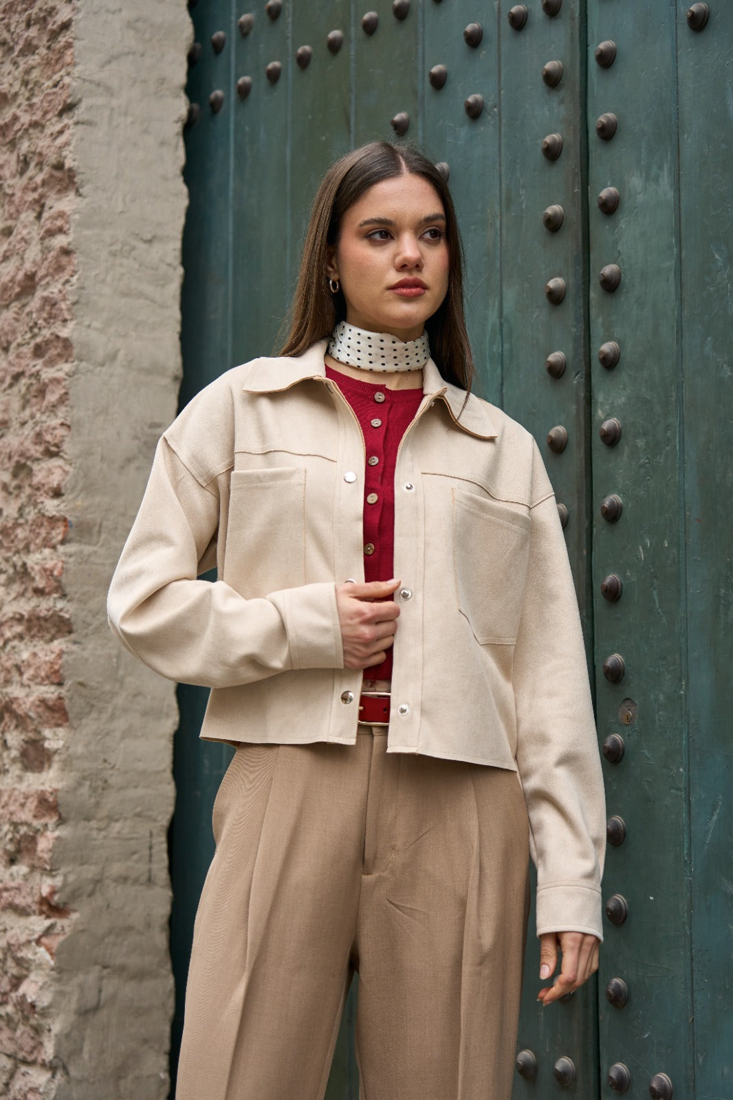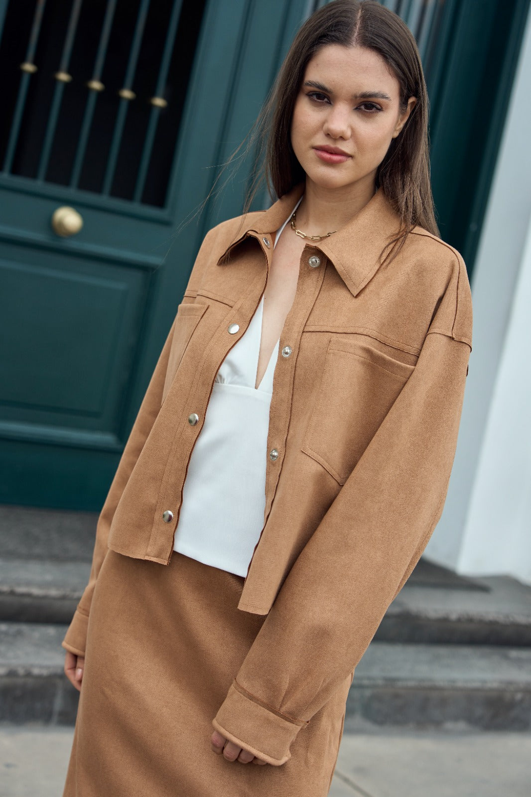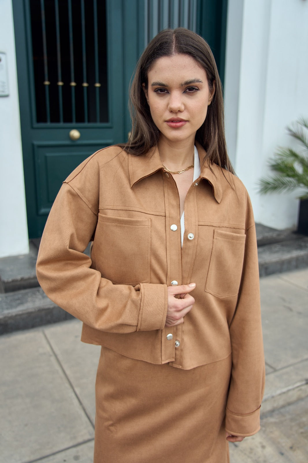 Casaca manga larga con cuello camisero, con broches en el delantero y en puños en tejido suede.