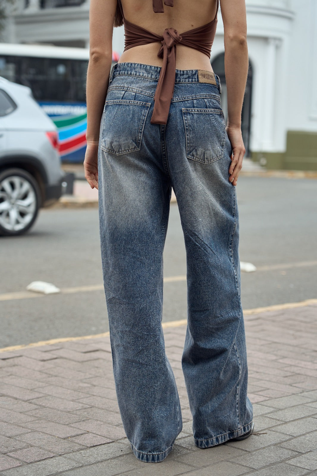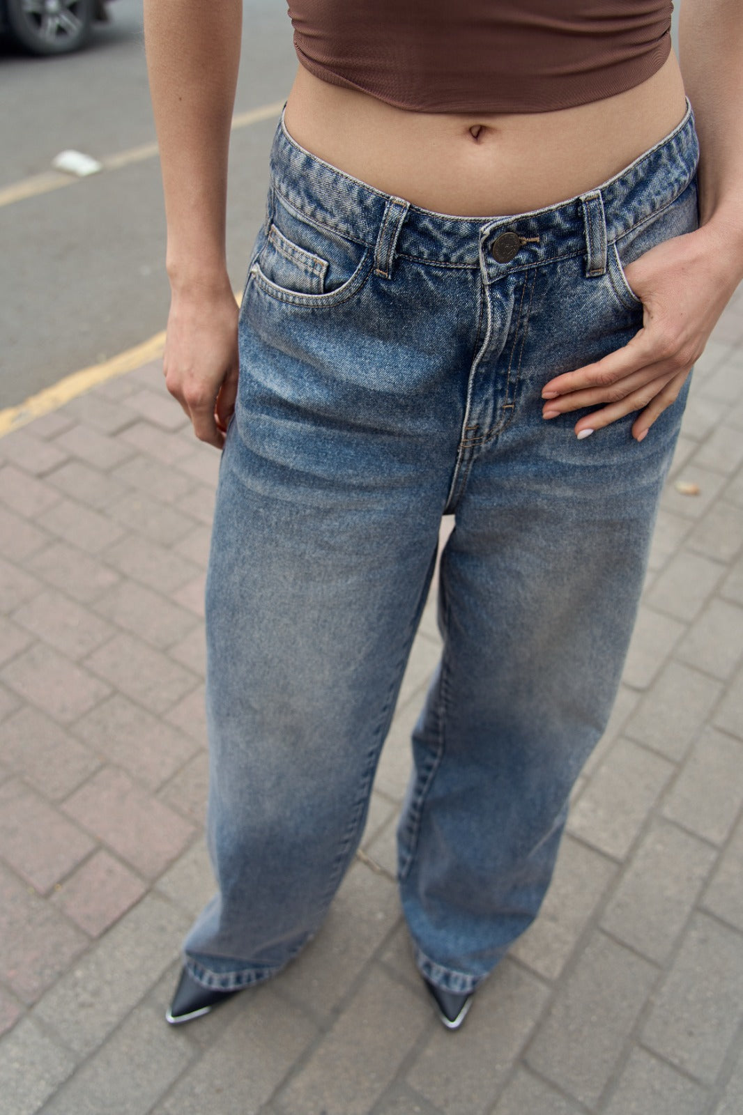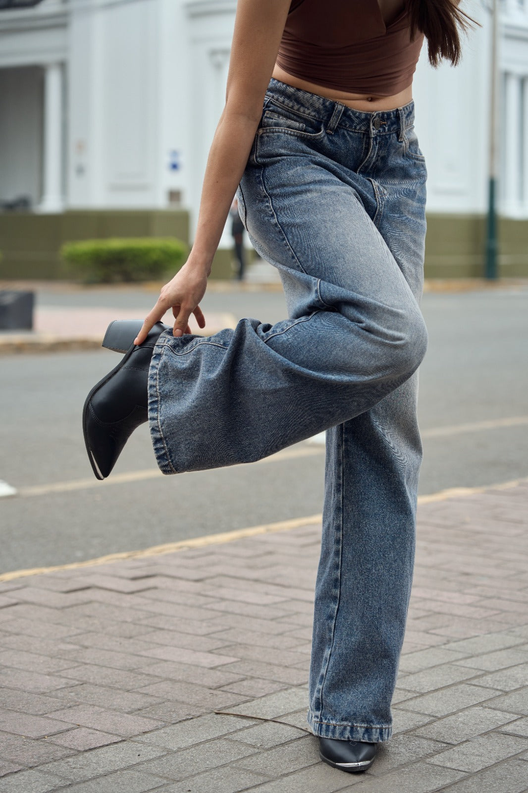 Pantalón wideleg denim con basta y focalizado.