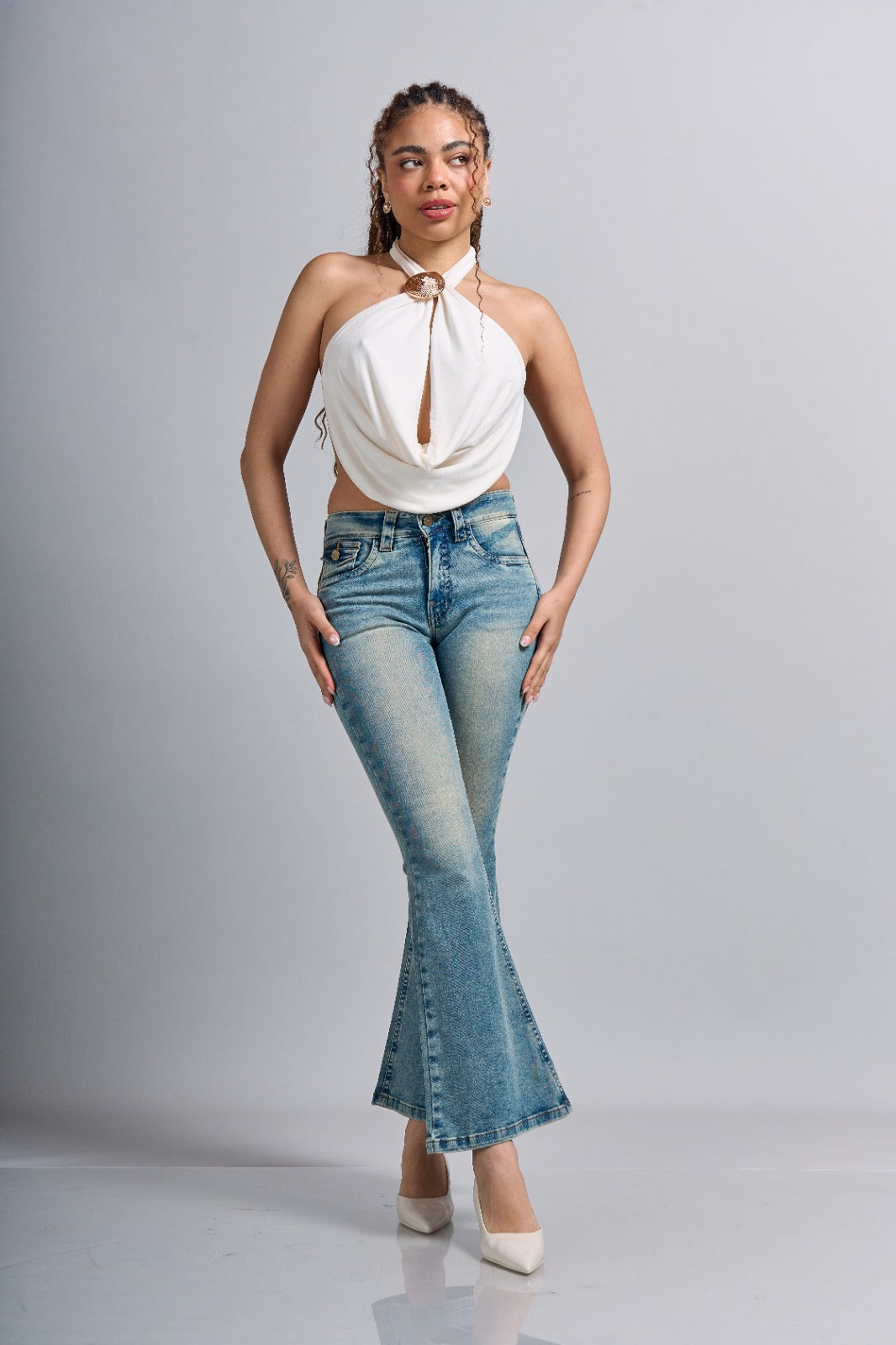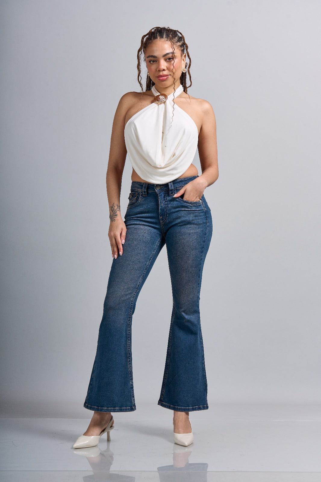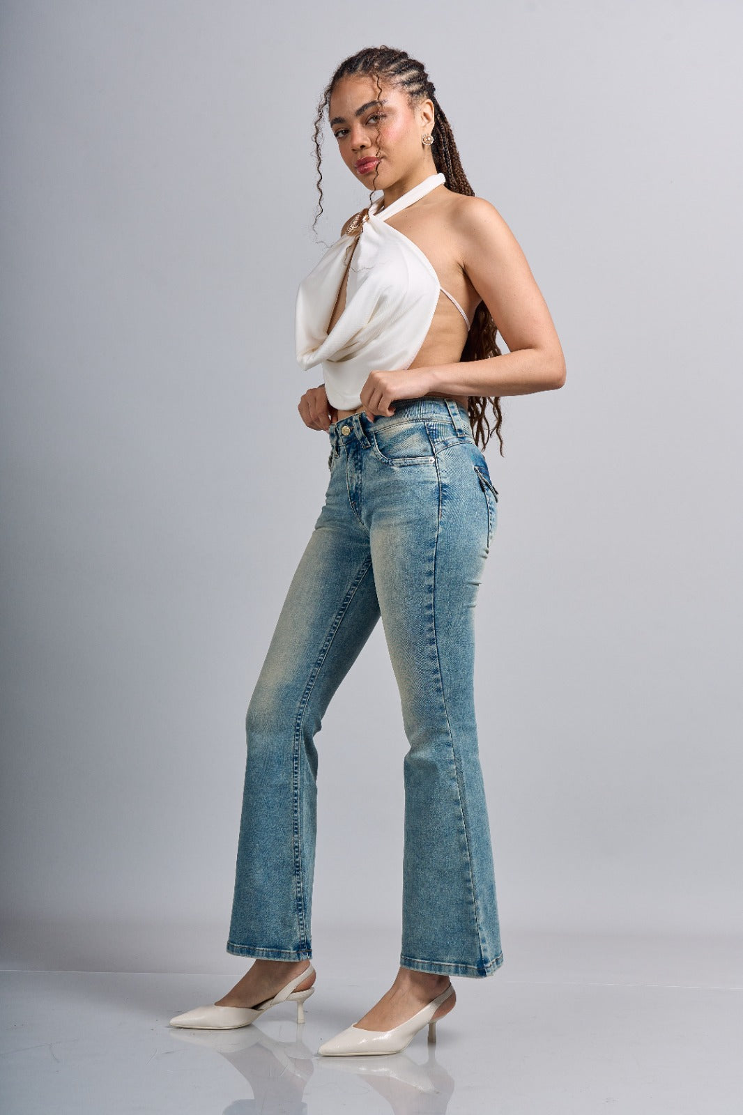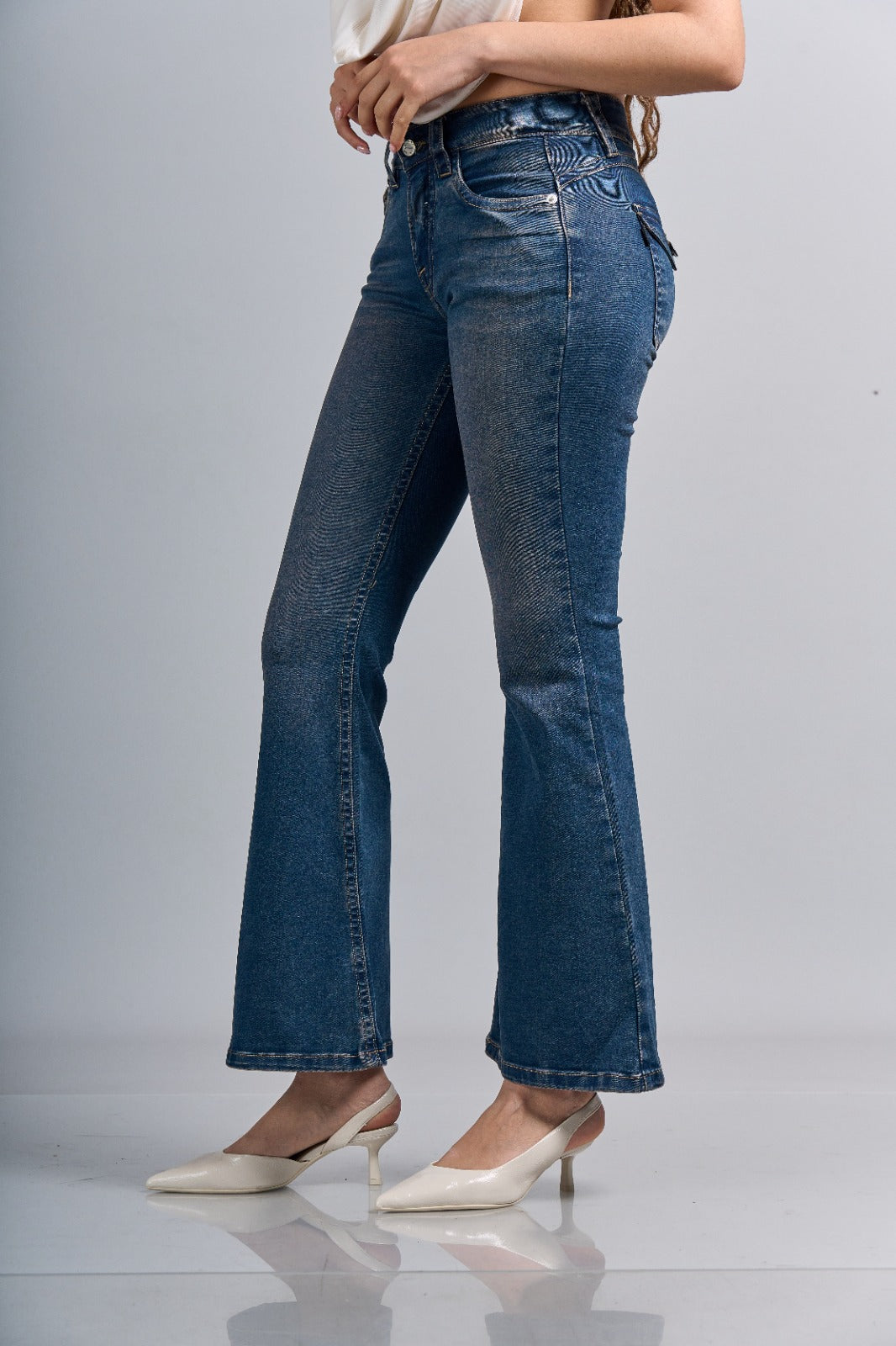 Pantalón flare denim strech c/bolsillo con tapa atrás.
