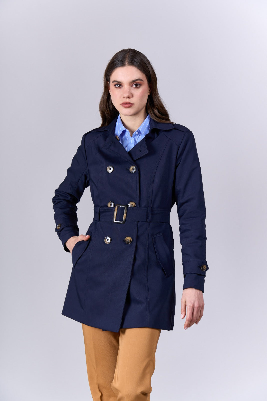 Trench entallado, bolsillos delanteros, interior forrado, puño con detalle de galones y botón y hebilla de carey.